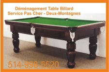 Déménagement de table de billard Deux-Montagnes - un service professionnel de déménagement de table de billard: désinstallation et installation, mise à niveau, changement de tapis, entreposage. Nous déménageon toutes marques et modèles de tables de billard, snooker, déménagement Montreal et Rive-Nord.